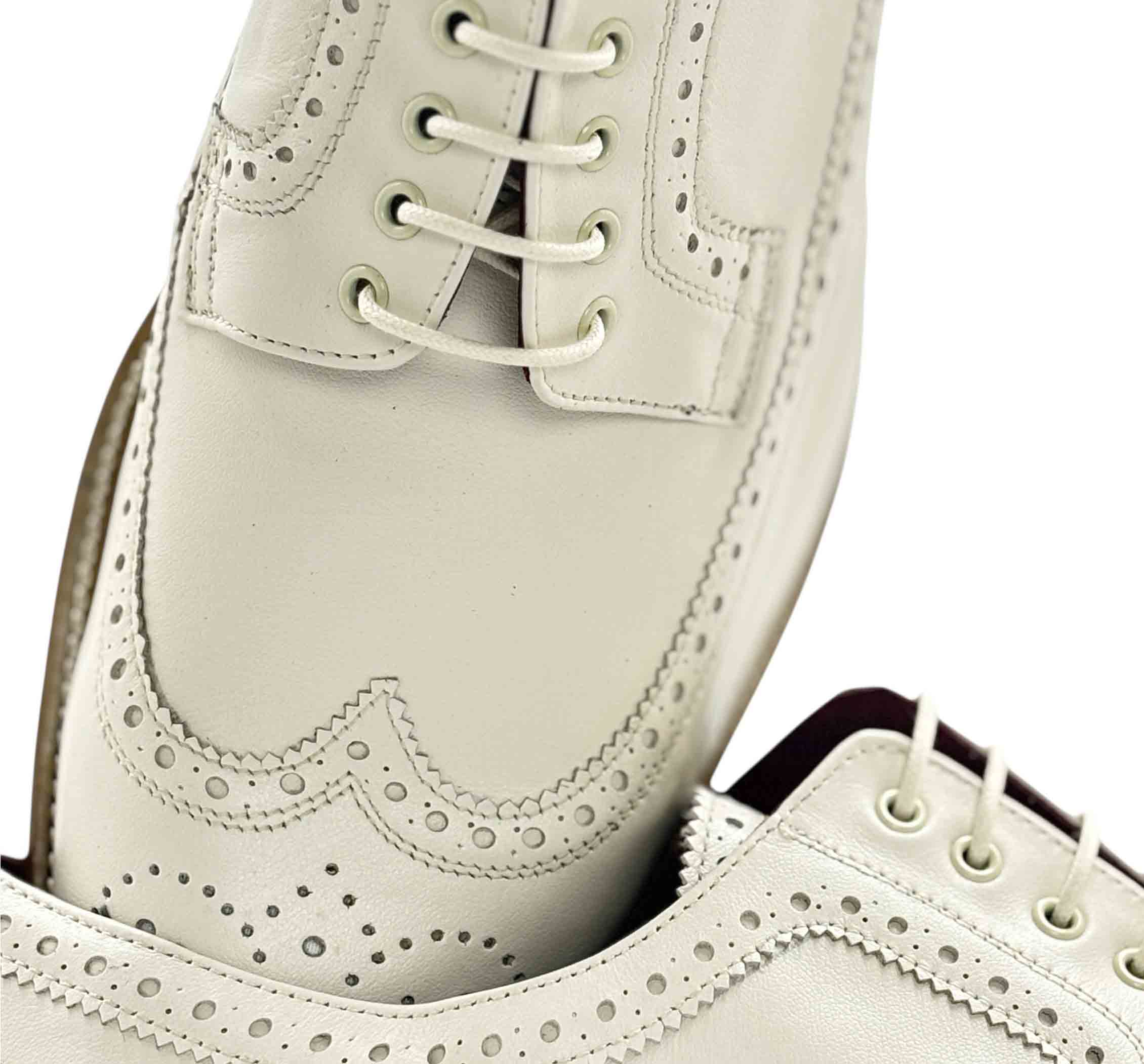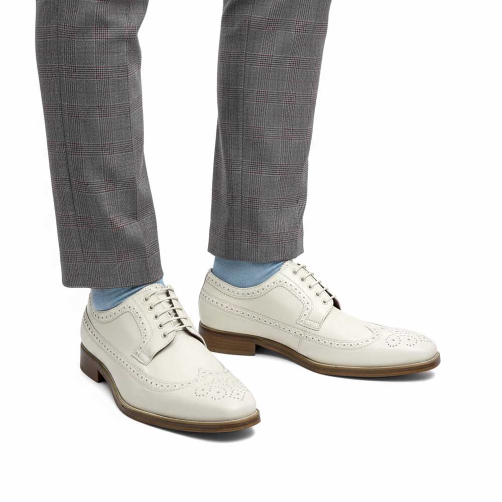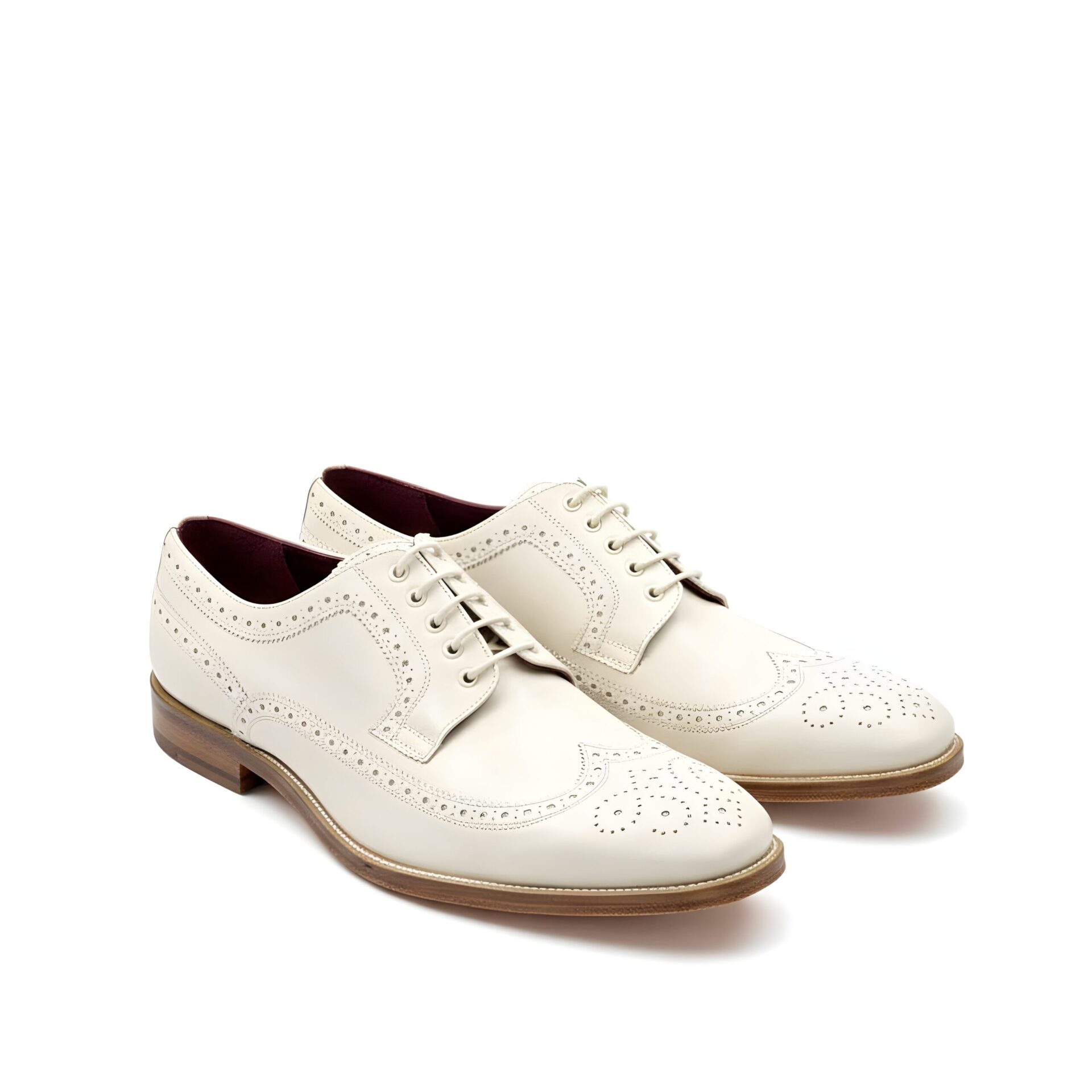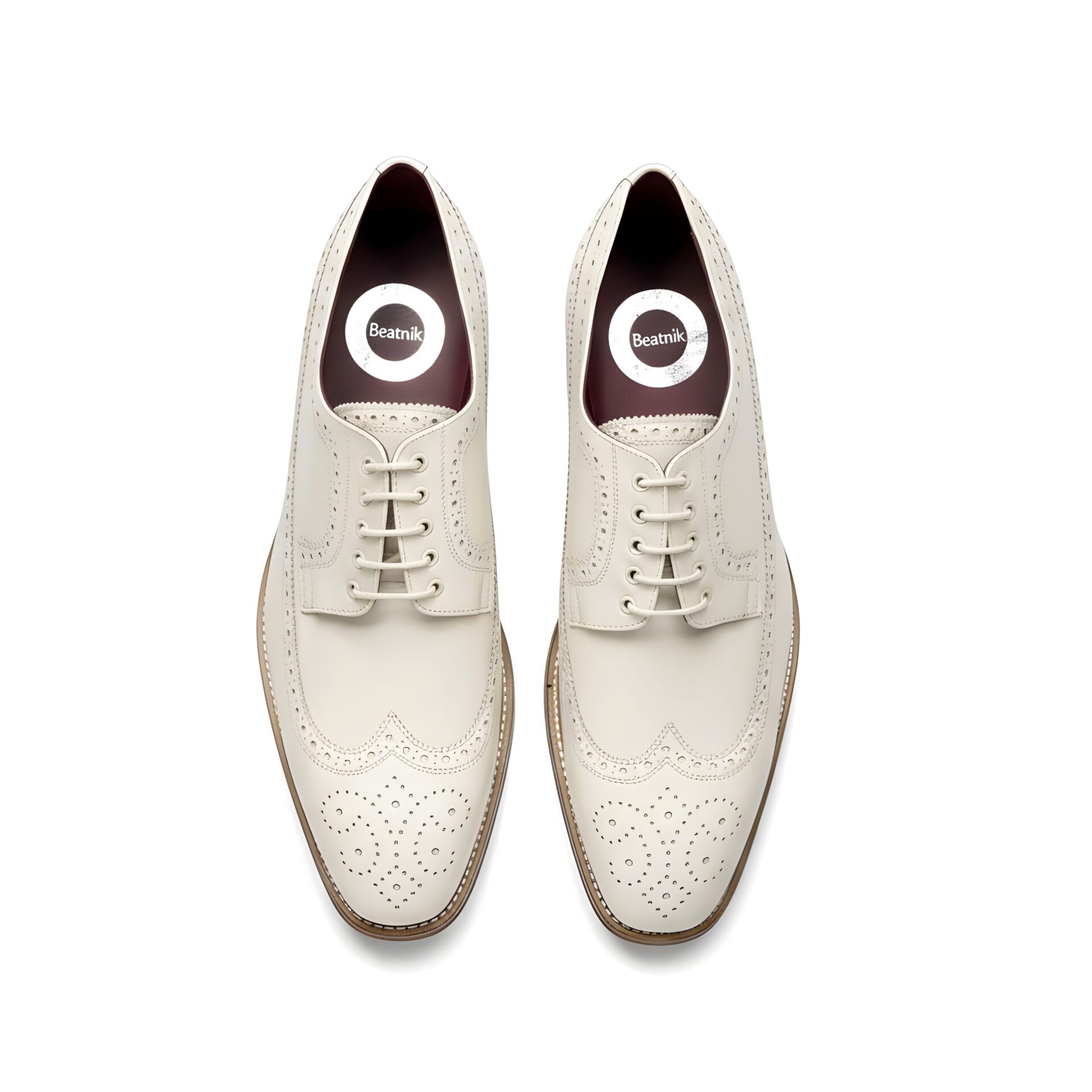 Klassisches Design, zeitgenössische Handwerkskunst. Das Modell Lucien Beige von Beatnik Shoes ist ein cremefarbener Blucher-Oxford-Schuh für Herren, der zu 100 % in Spanien hergestellt wird und den traditionellsten englischen Stil mit der Exzellenz von Kalbsleder und dem Komfort handgefertigter Schuhe verbindet.