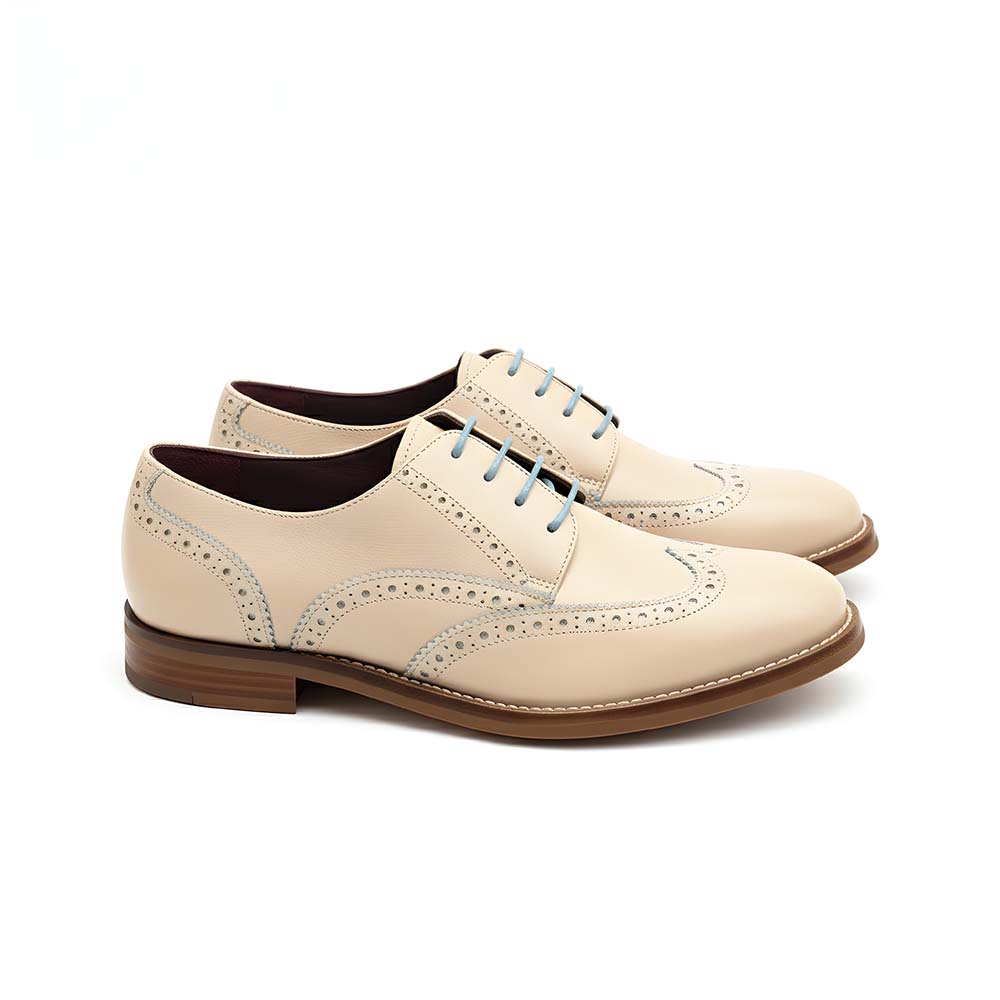 Our beige Derby style lace-up shoes for women is one of the most popular novelties this season. The combination of a classic Brogue Blucher shoe design with the softest calfskin in the sweetest color, achieves the incredible result of our Ethel Beige women’s Blucher.