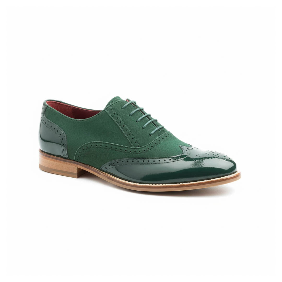- Outer material: dark green suede and green patent leather.