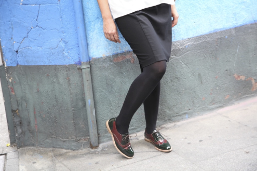 As an example of how well the Oxfords combine with a simple black short skirt. Here you have this combination with one of our best-selling models, the colorful Oxford bicolour Lena Green on red.