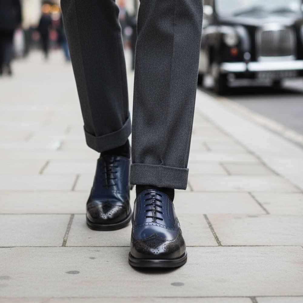 En regardant nos garde-robes, les tons sombres et les bleus dominent en hiver. Nous les avons combinés de manière discrète. L’ensemble du dessus et du dessous est noir, ce qui donne à première vue une élégante brogue noire. Mais le haut du laçage est bleu cobalt foncé. Une combinaison tout simplement étonnante avec n’importe quel costume gris ou marine, clair ou foncé. Et avec n’importe quel modèle de pantalon, qu’il soit uni ou à mille rayures, il est tout simplement spectaculaire.